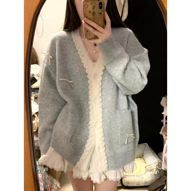 ブルーリボンセーターカーディガンコート女性の秋と冬の韓国スタイルルーズ怠惰なスタイルのセータートップ