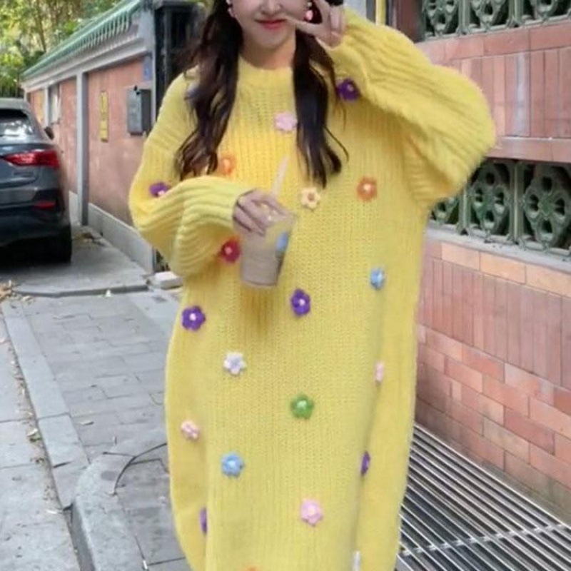 秋冬の女性のための優しいカレッジスタイルの花柄ニットドレス新色遊び心のある年齢を減らすかわいいボトリングセータードレス