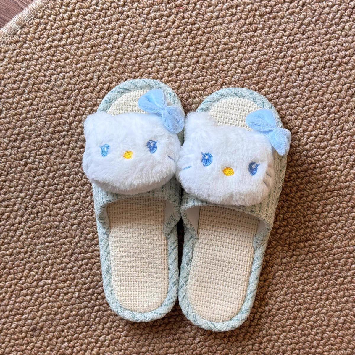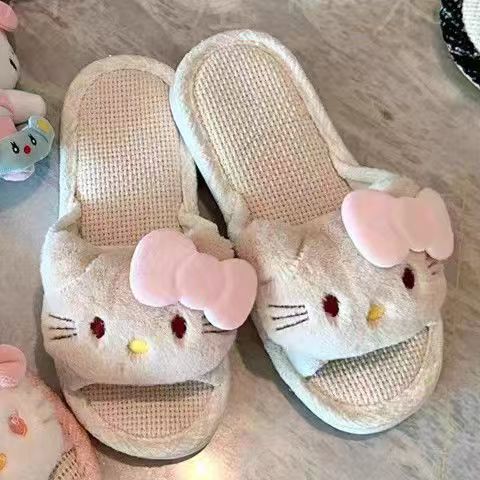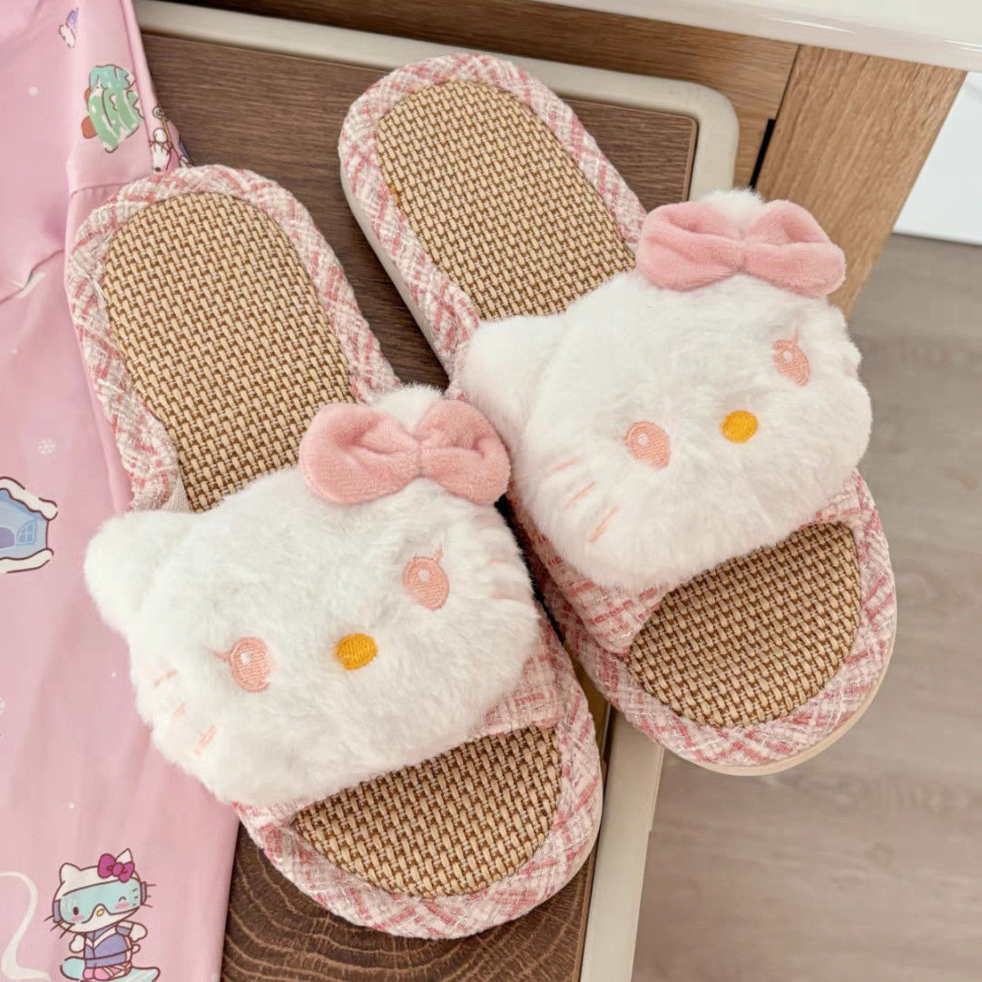 【即納】日系可愛い リネン キティ 布製クールサンダル 家居用 通気性 吸汗 滑り止め クッション感 ワンストラップサンダル