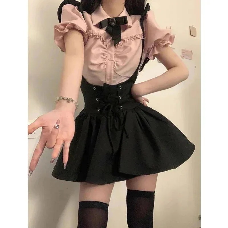 スパイスガールストラップドレス女性用セットサマーパフワンピースデザインショートドレス ファッショントップス 2点セット 夏服レディース上着 半ズボン セットアップ 地雷系 原宿系 ダ