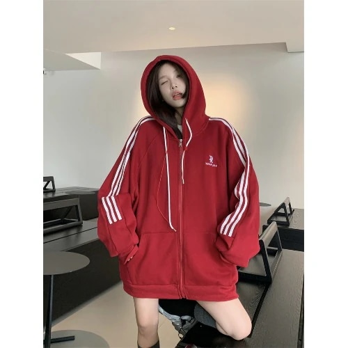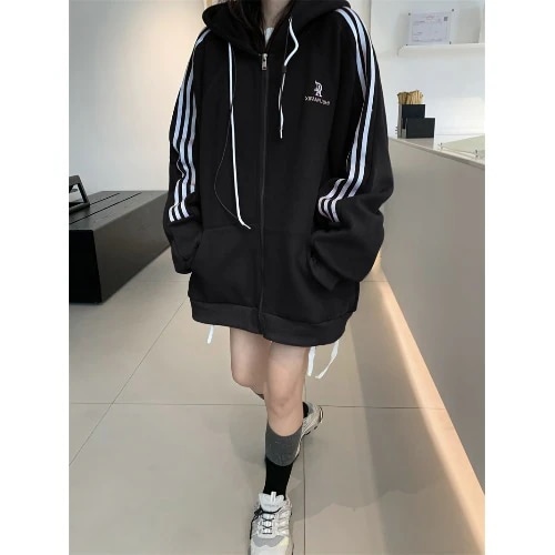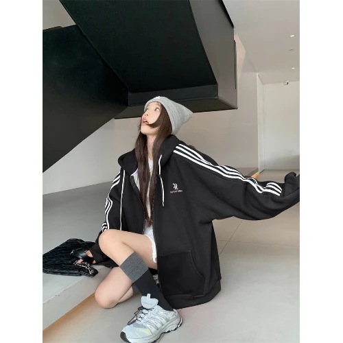 2024 秋冬トップス パーカー 裹起毛 2type フード付き チャック長袖ストライプゆったり細見え白黒おしゃれかわいいガーリーキュート 甘め 韓国ファッション レディースサイドお出かけトラック