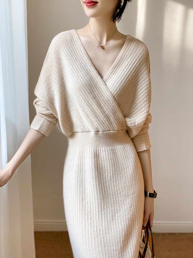 ニットワンピース ドレス 韓国ファッション 気品セーター ワンピース Vネックロングワンピース インナーワンピース ワンピース パーティードレス トップス 長袖 ワンピース