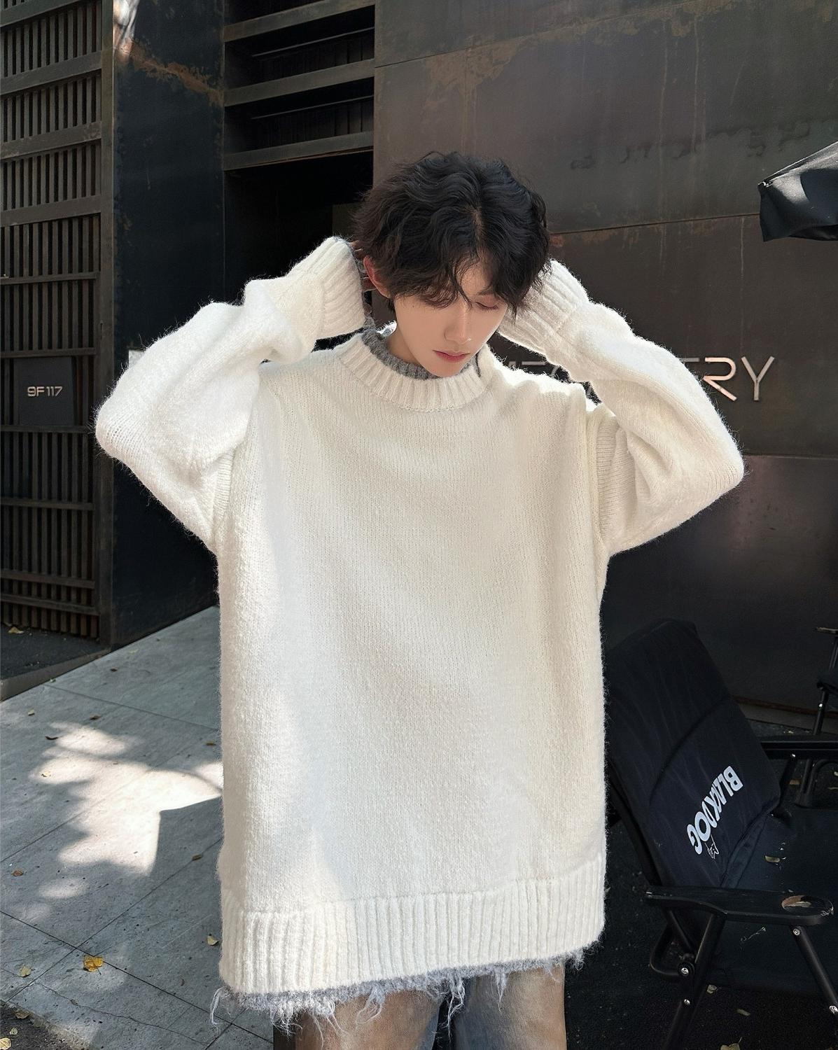 韓国ファッション 体型カバーチュニック 男装の白いニットコートがかっこいいゆったりとした怠け者風フェイク2枚のカップルセーター男前秋冬モデル
