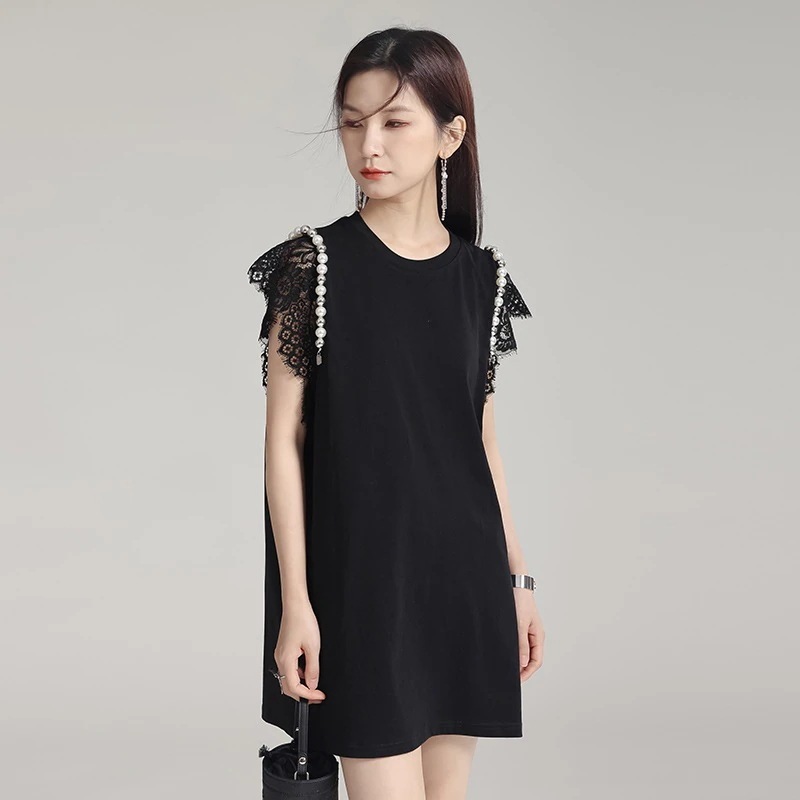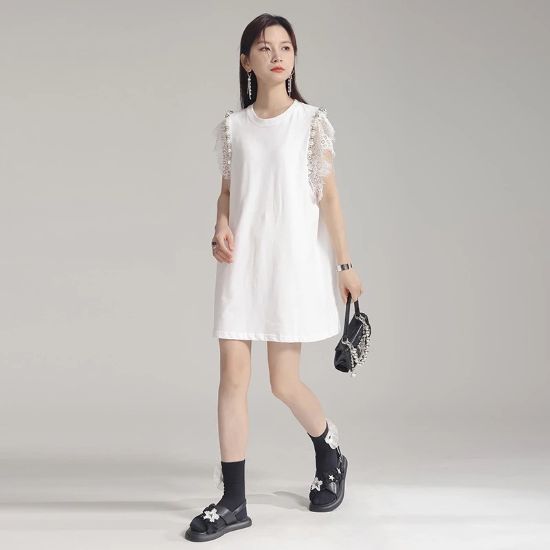 【J.Fashion】 ロンT レース袖 夏 ショートワンピース風 チュニック ロングTシャツ レディース ロングブラウス 夏ワンピ 個性的なデザイン 関連商品は店で購入可能30%までに制限