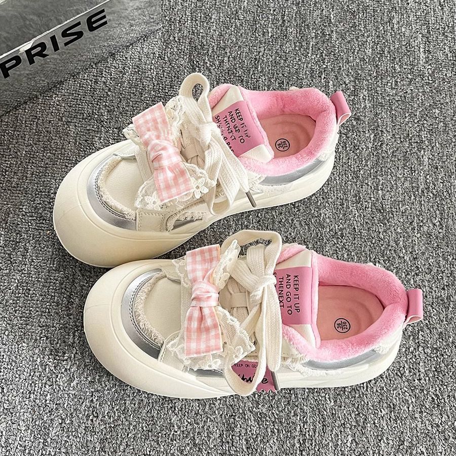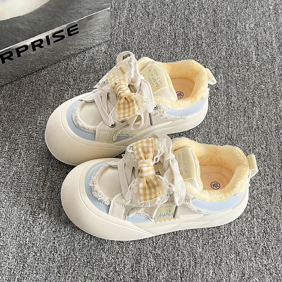 韓国ファッション 厚底サンダル リボンとベルベットの板靴女性の秋冬の新しい100足靴厚底の白い靴パンの婦人靴