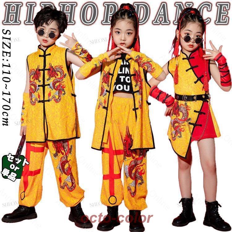 黄色 竜柄 浮世絵 キッズ ダンス衣装 男の子 女の子 かっこいい 中国 唐装 チャイナ風 ベスト おしゃれ ゴールド チャイナボタン 中華服 トップス パンツ jazz30%までに制限