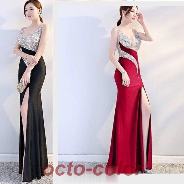 Vネック イブニングドレス スリット ノースリーブ ブラック ワイン赤 マーメイドドレス スリム 着痩せ パーティードレス 二次会 お呼ばれ30%までに制限