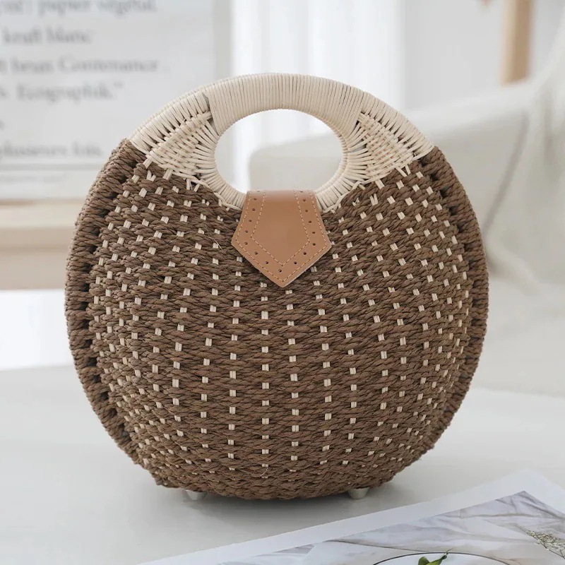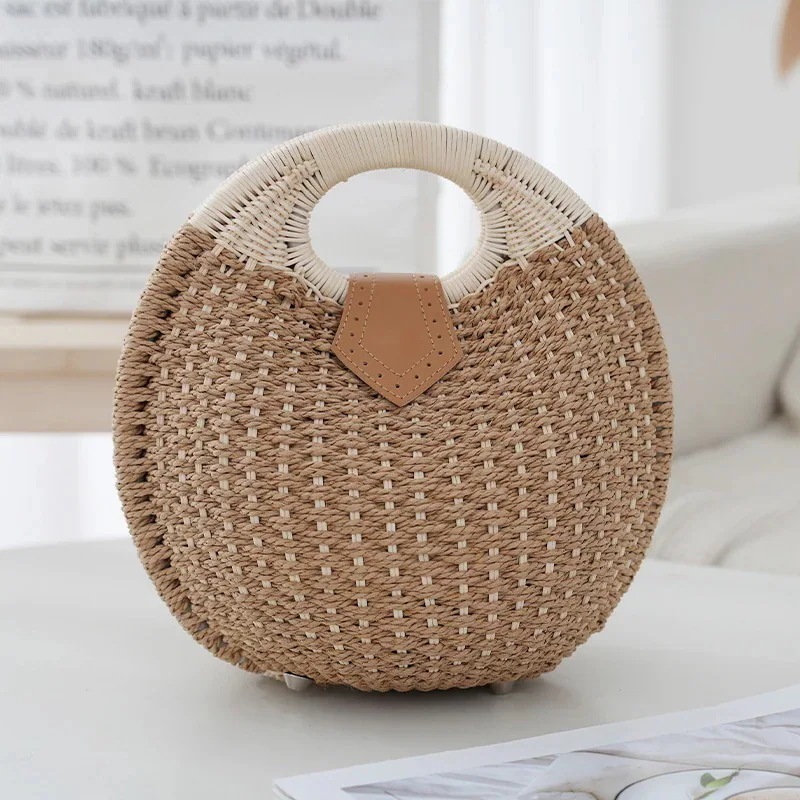 【2点購入で1OO円オフ】かごバッグ 秋新作 人気 丸型 サークル シェル型 藤のハンドル カラー ボタン留め 内張り付き 大容量 手提げ レディース