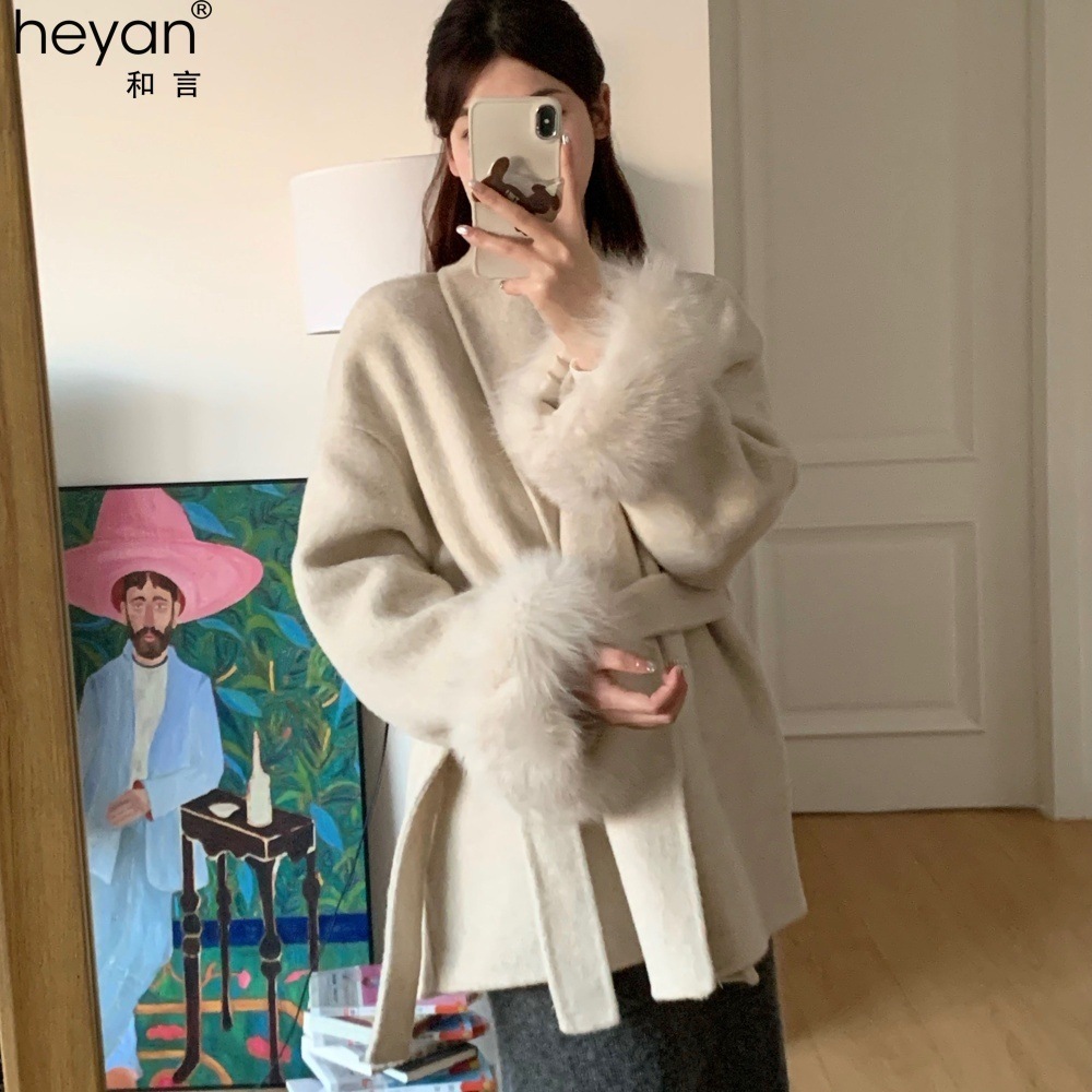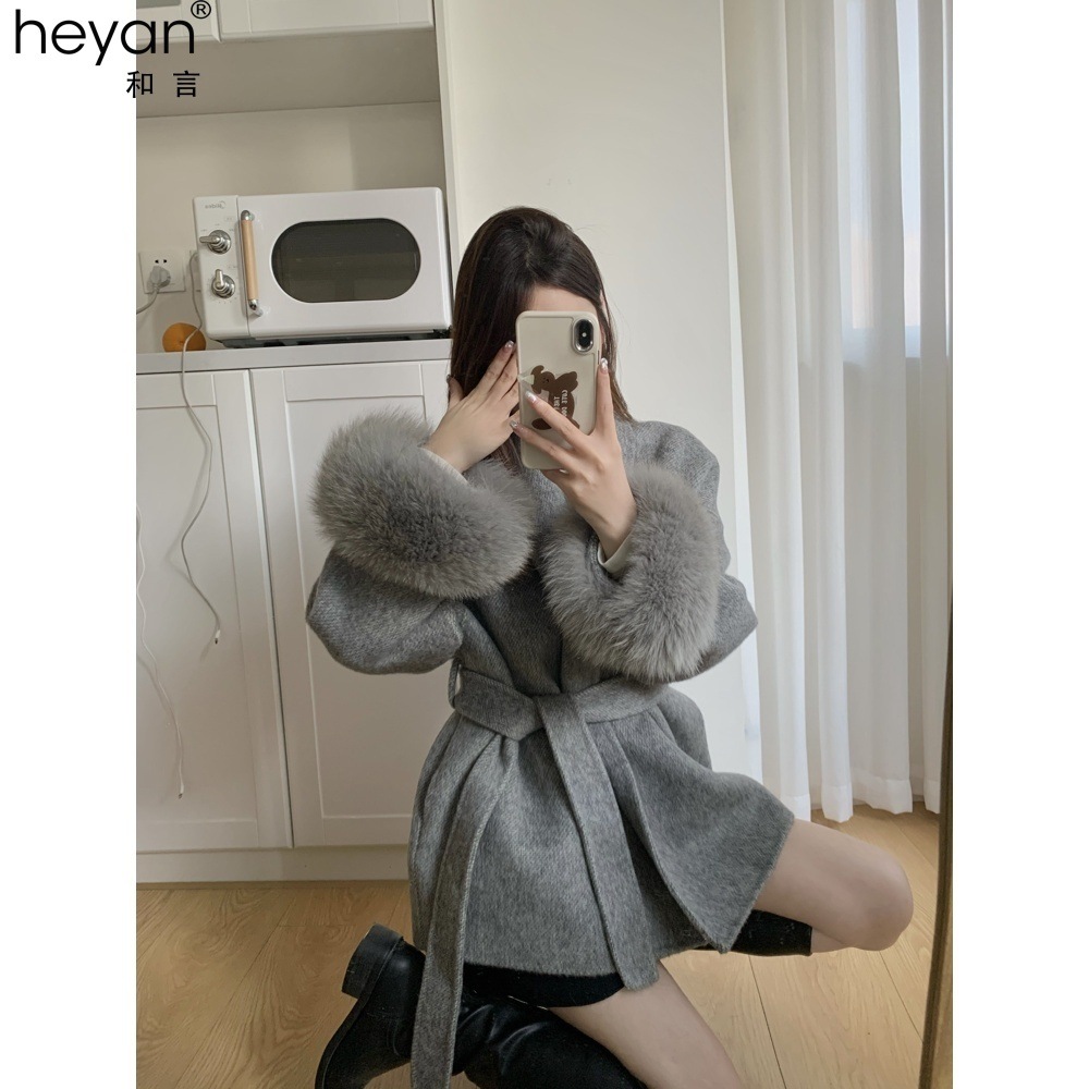 韓国ファッション 人気アウター ウエストマントの毛を取り入れたコート秋冬新作ヘボン風ゆったり着やせグレーのトップス
