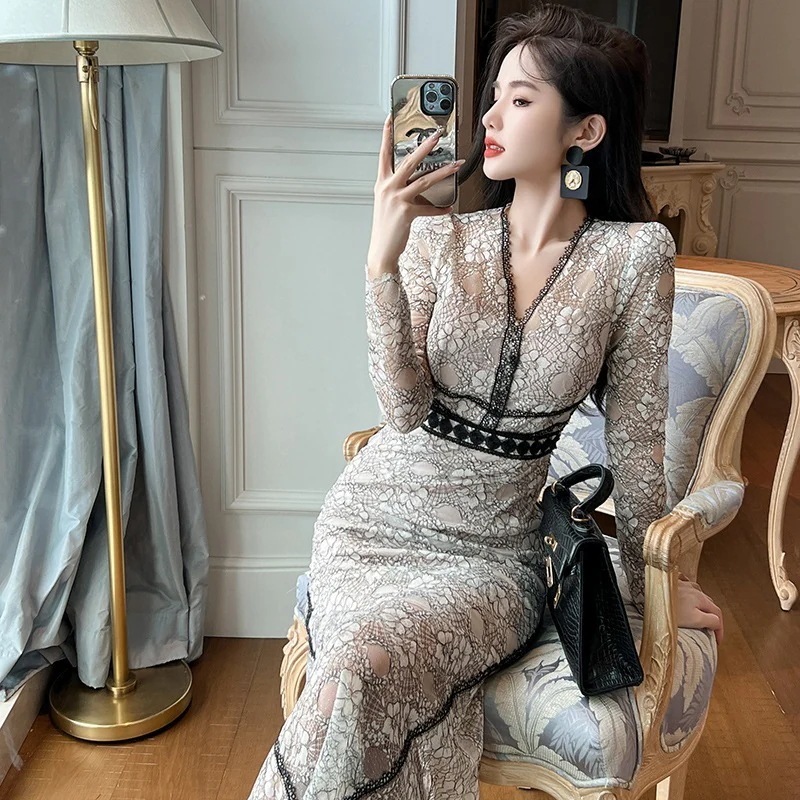 秋冬 Vネック レース マーメイド ロングワンピース 花柄 パーティードレス キャバ 着痩せ 大人 同窓会 披露宴 卒業式 結婚式 演奏会 ウェディング 二次会 発表会30%までに制限