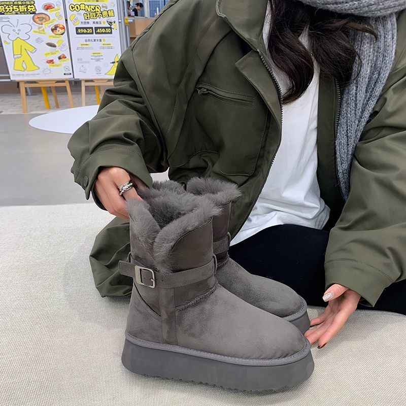 ショートブーツ 韓国ファッション グレーのスノーブーツ毛皮一体の毛靴開襟騎士東北ニーハイベルトバックルスノーブーツブーツブーツ
