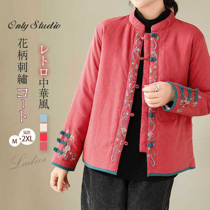 中綿 コート レディース 花柄 刺繍 長袖 ジャケット トップス アウター 中華風 羽織り 厚手 上着 防寒 秋 冬 綿入れ 中綿コート 立ち襟 カーディガン ボタン エレガント ゆったり 着瘦
