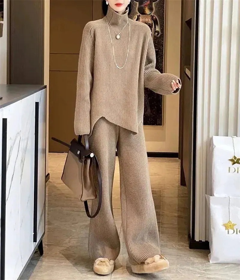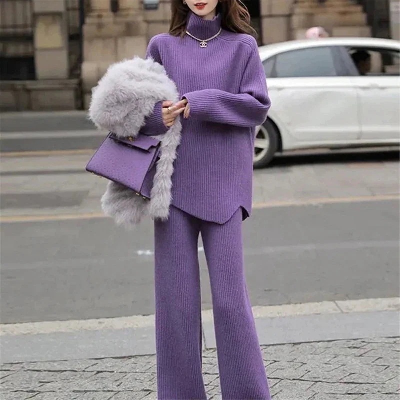 セットアップフレンチファッションレディースセータータートルネックトップス+ハイウエストカジュアルワイドパンツ2点セット