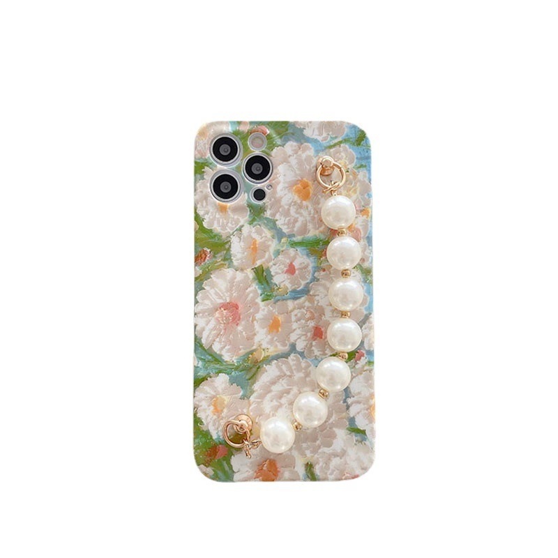 【2枚購入で100円OFF】オイルペイントの花柄チェーン付き 対応機種iPhone 15/16 Pro/13/15 Pro Max フルカバーソフトタイプのスマホケース ウォーターテープ仕様