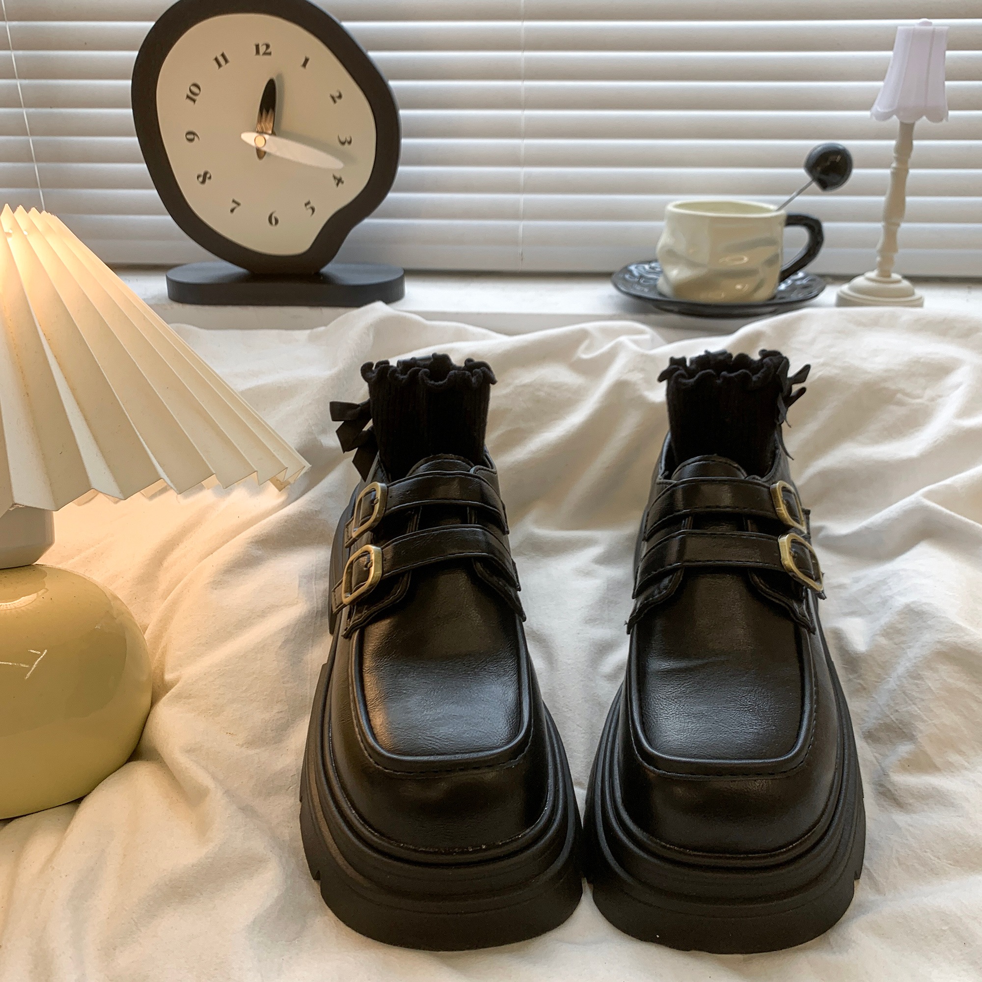 韓国ファッション 厚底サンダル 厚底ブラウンの小さな革靴女性2024秋の新作レトロな楽福靴百足増高単靴
