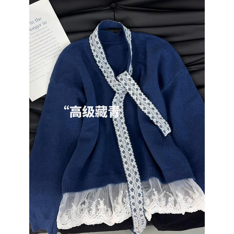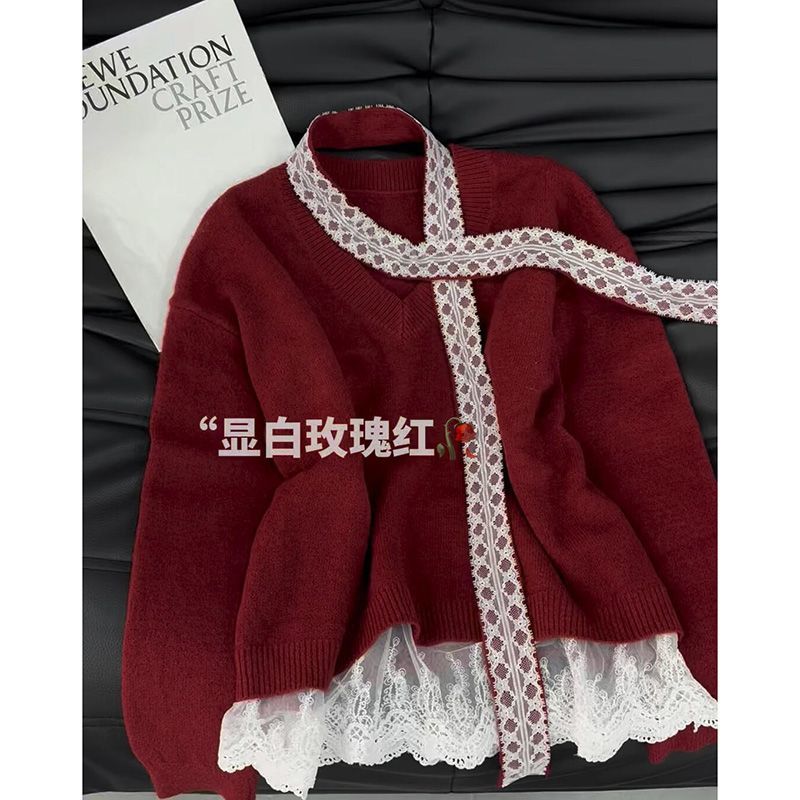 韓国ファッション 人気なリブニット 甘め風レースのキルティング裾デザインニット女冬赤新年ゆったり着やせ減齢セーターブーム