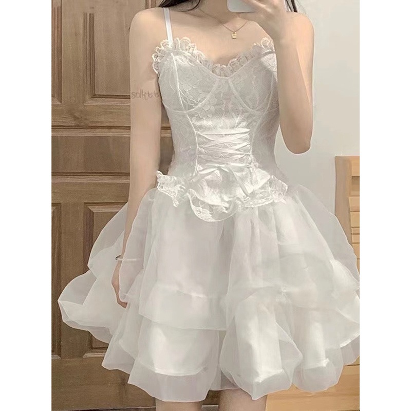 セットアップ 韓国ファッション バレエ風セクシーサマースーツ女性用胸当てレースニットキャミソールプリンセスポンポンスカート2点セット