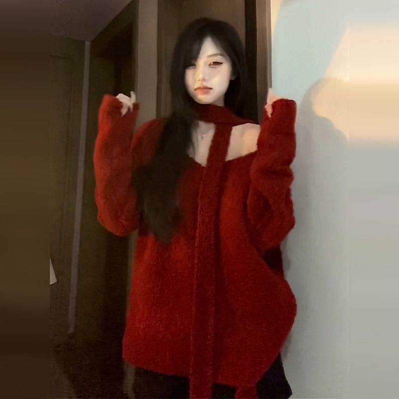 人気なリブニット 韓国ファッション 赤セーター秋冬2024秋冬新作ミディアムゆったりニットトップス韓国系