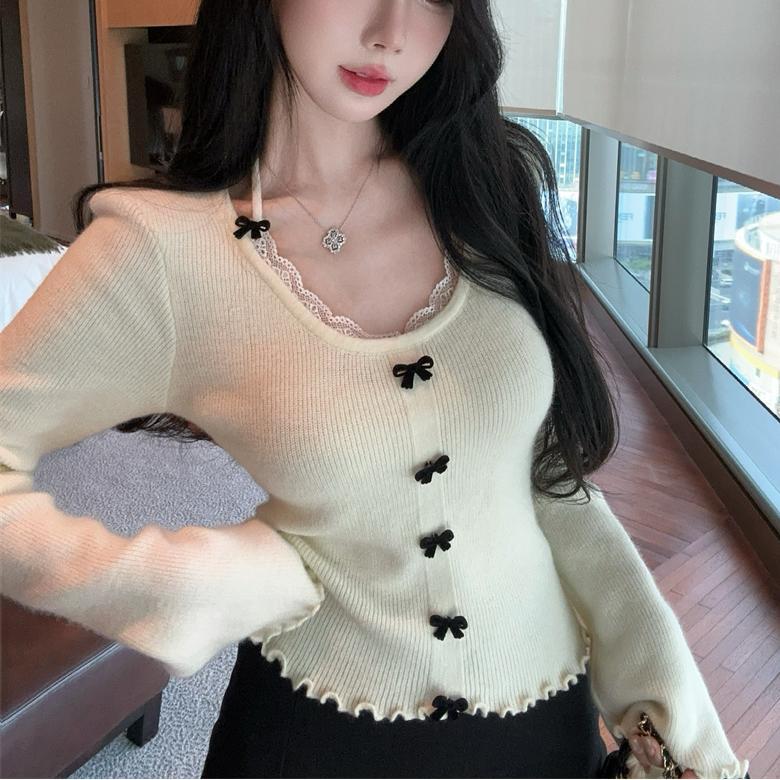 2025秋冬の新作 首かけニットトップス 人気なリブニットレディース フレンチレースパッチワーククルーネック長袖ニット セーター ニットカーディガンアウター 快適 通勤