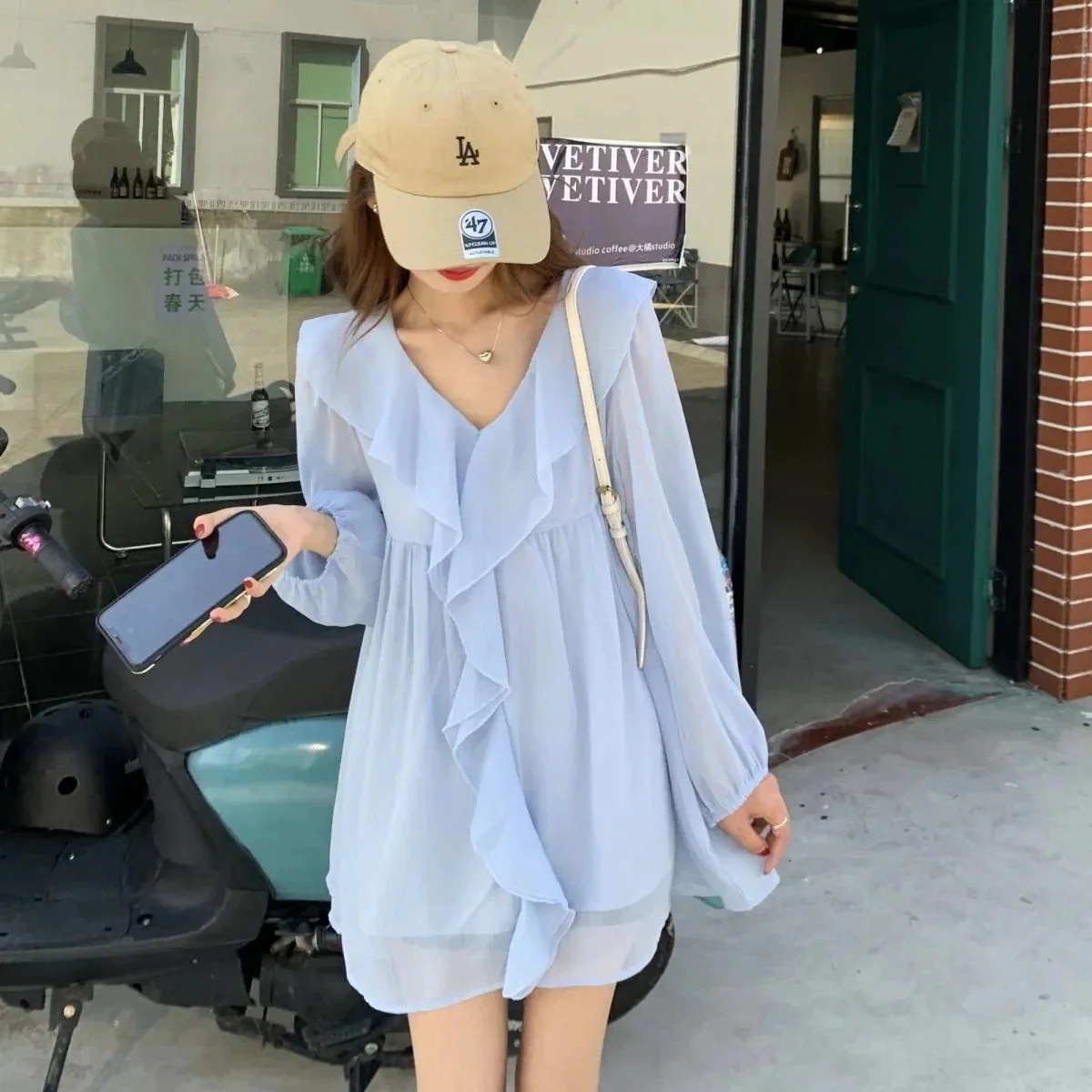 シャツ ブラウス シフォンブラウス プルオーバー フリルブラウス 長袖 パフスリーブ ボリューム袖 フリル 着痩せ 無地 二の腕カバー ペプラム ウエストリボン シアー アシンメトリー V