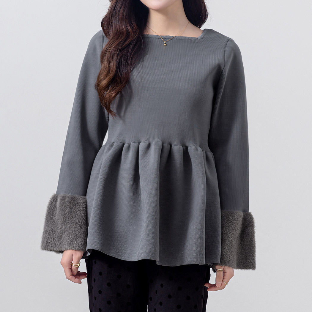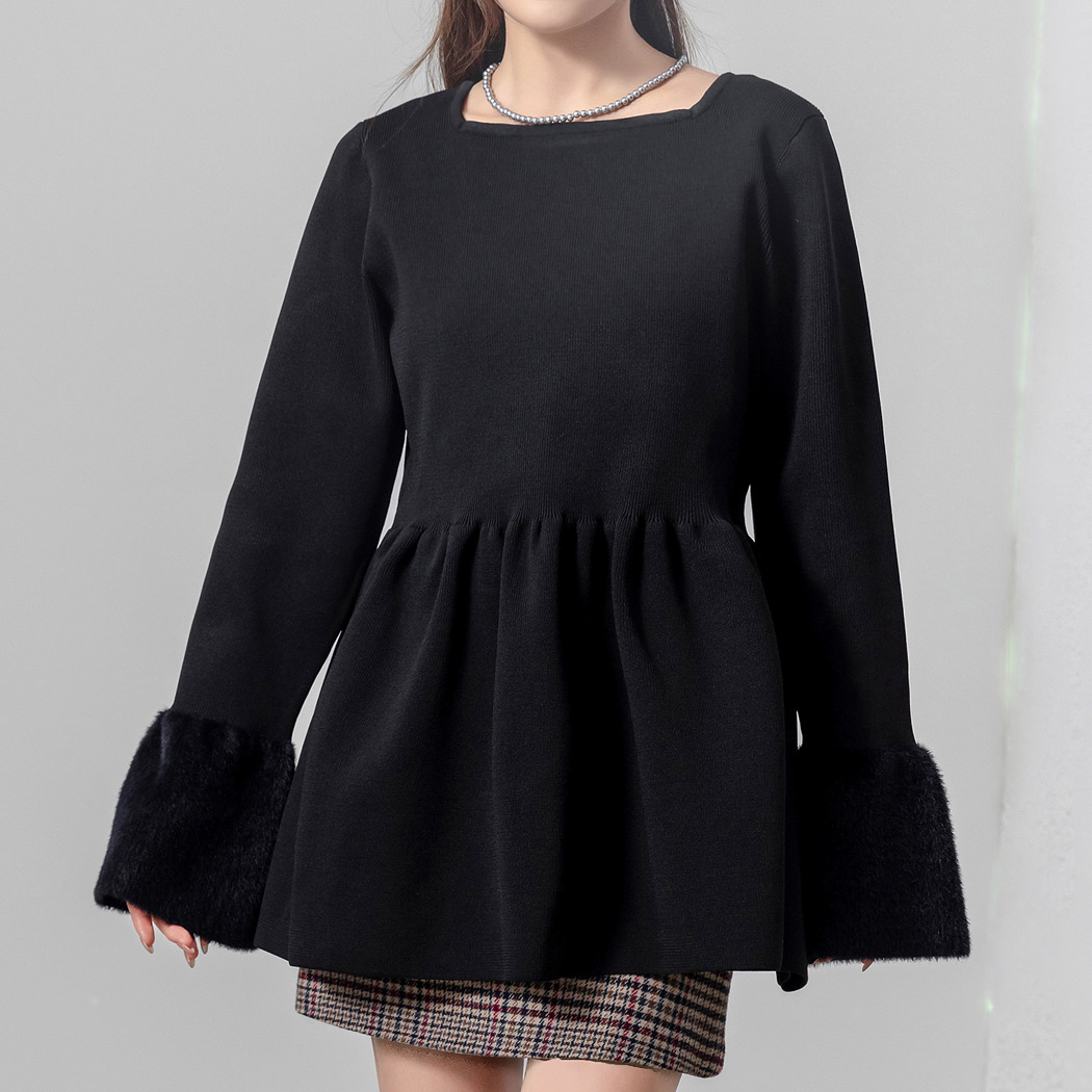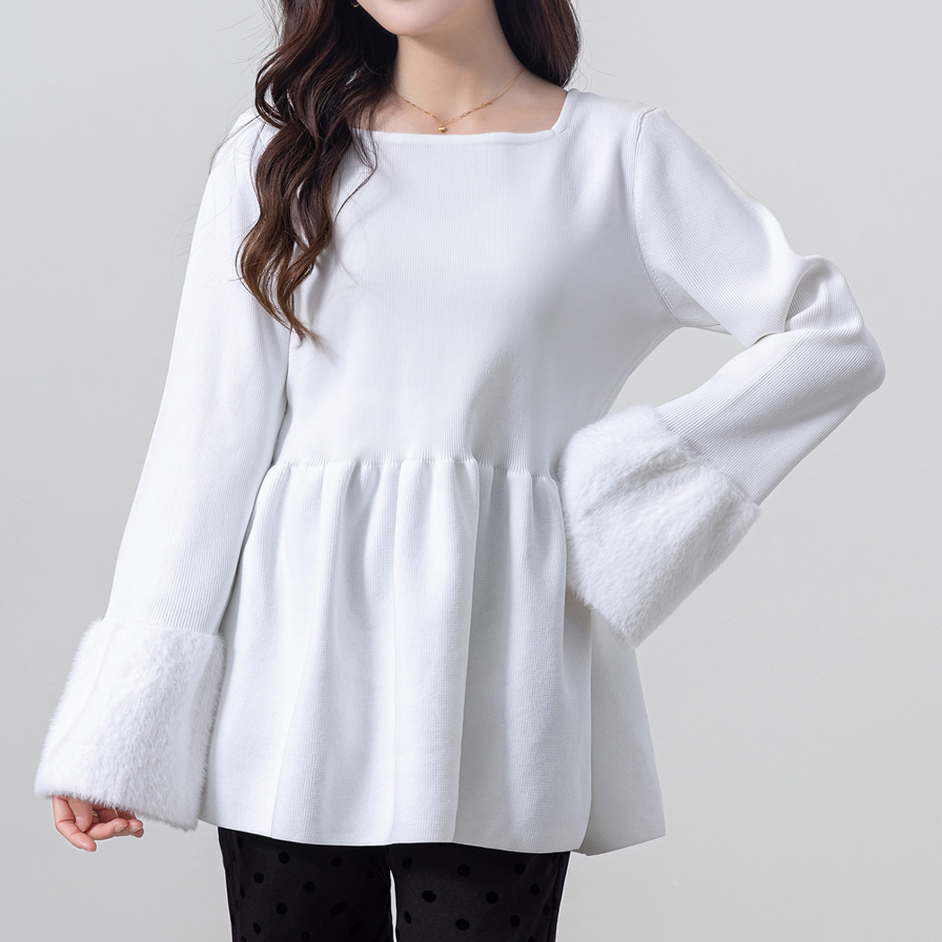 ペプラム ニット トップス レディース 長袖 きれいめ リブ ベルスリーブ シャギーニット フェイクファー プルオーバー 黒 白 秋 冬