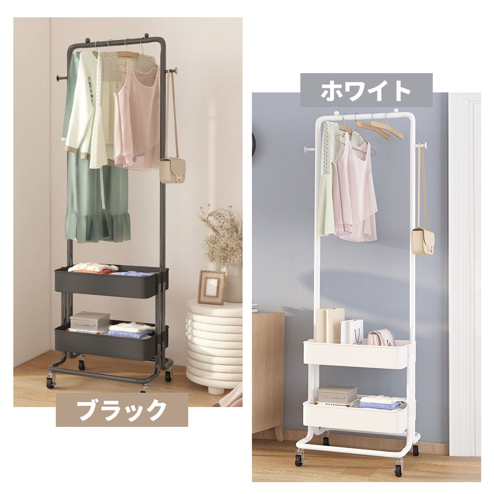 ハンガーラック 大容量 キャスター付き 移動可能 収納バスケット フック付き 省スペース 組立簡単 シングル 衣類収納 小物収納 雑物収納 一人暮らし WBGHS-01-DE ハンガーラック 大容量