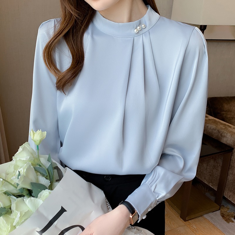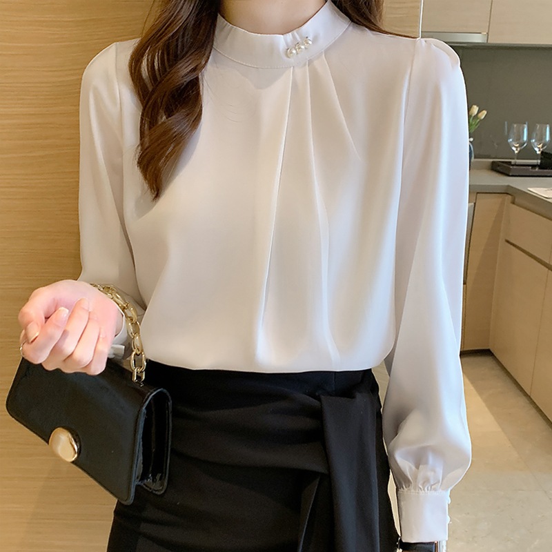 シャツ ブラウス レディース 長袖 パール 立ち襟 トップス 大人 可愛い 上品 エレガント ゆったり 体型カバー 着回し ファション オフィス カジュアル フォマール デート 通勤 春秋冬