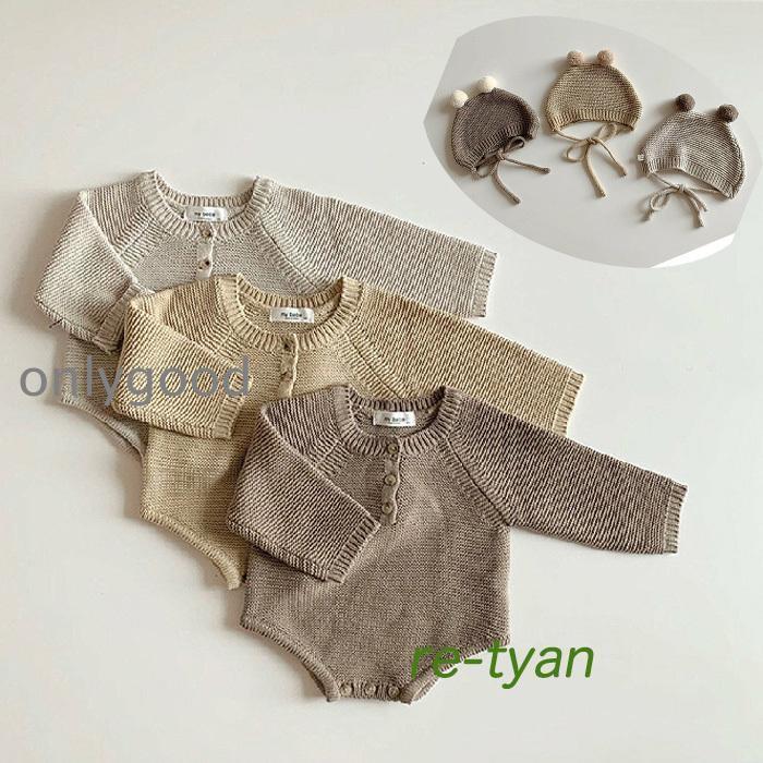 ニットロンパース ベビー服 つなぎ服 女の子 男の子長袖 おしゃれ 可愛い オールイン 子供服 カジュアル 帽子 春秋66cm/70cm/80cm/90cm 無地 キッズ