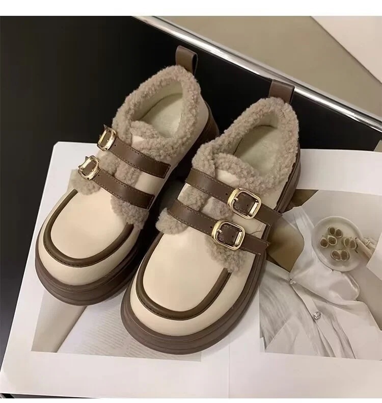 急速発送 冬学生用ローファーシューズ レディース厚底背アップ フリース入り保温 外出用低身長棉靴