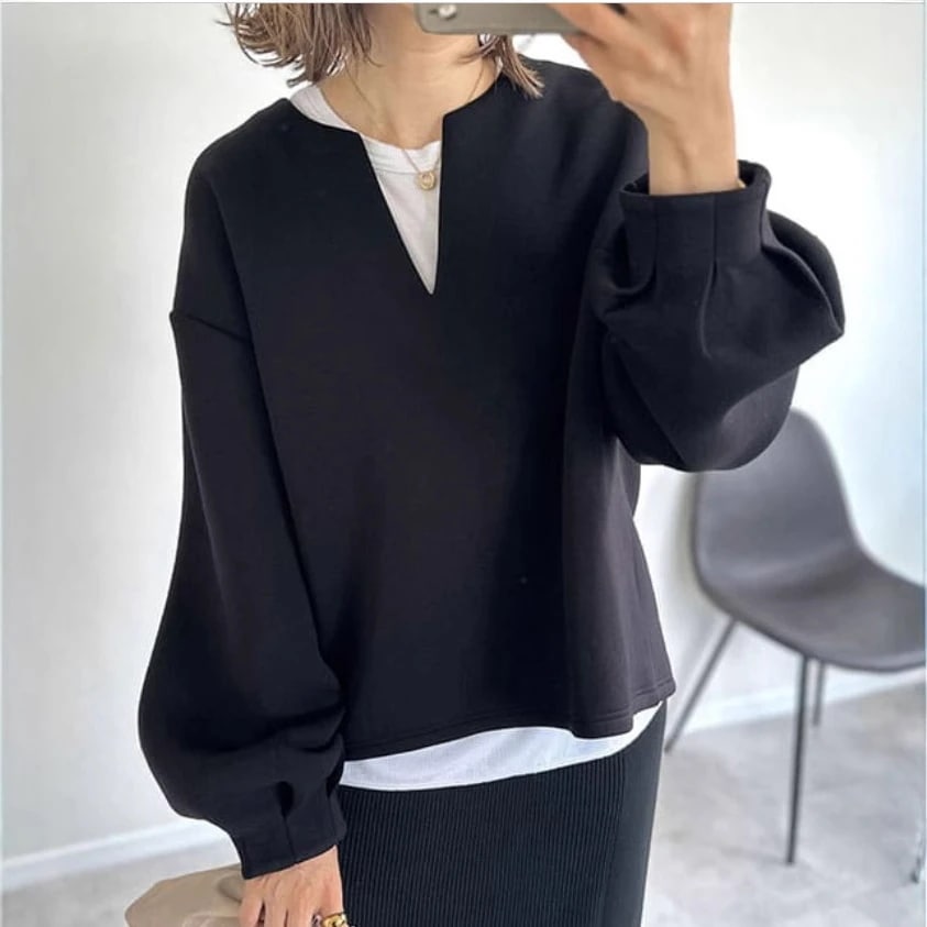 色違いで2枚黒とベージュかいました。首が短い民なのでこのネックの形はとても素敵でした。ネックレスを見せる感じで大人っぽく着たいと思います。