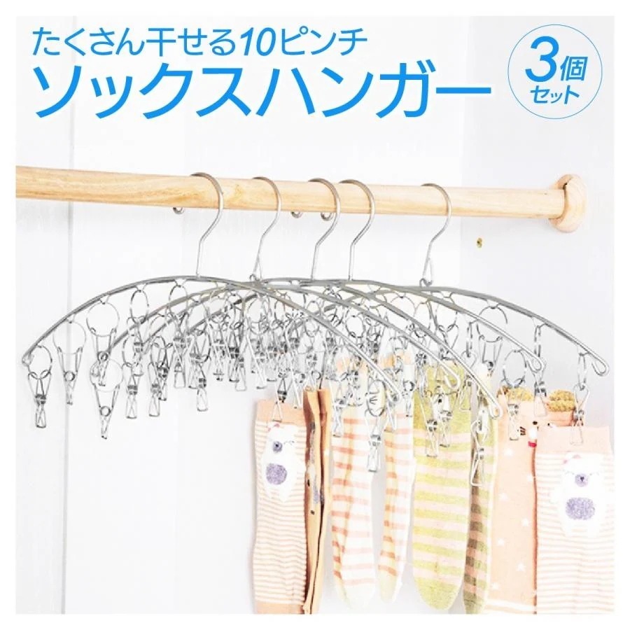 人気 ピンチ付 ステンレスハンガー ソックスハンガー 3本セット 洗濯バサミ10個付 クリップハンガー 洗濯 物干し 下着 ブラジャー 収納 新生活 socks-hg