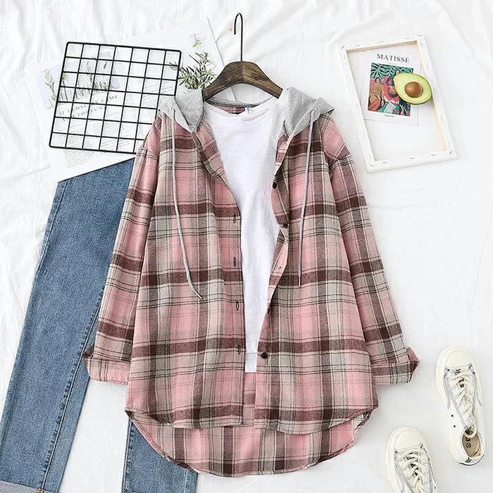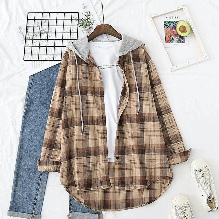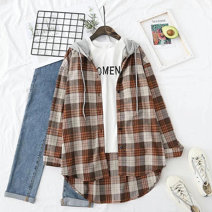 チェック柄 シャツ 長袖 レディース チェック柄 シャツ 大きいサイズ トップス ユニセックス 長袖シャツ シャツブラウス 春 シャツジャケット 羽織り フード付き ゆったり 体型カバー アウター