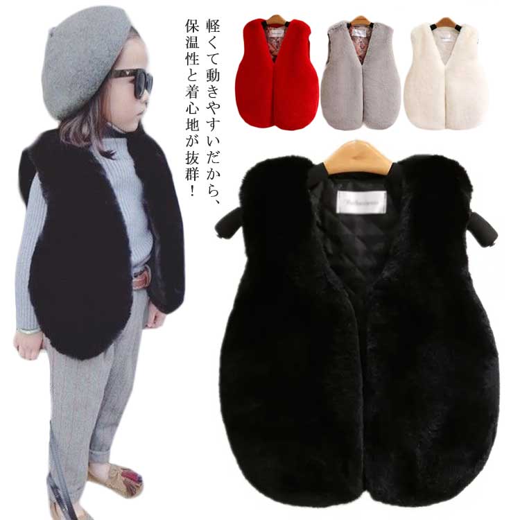 フェイクファー 110 ふわふわ ショート丈 子供服 子ども服 ジレ ファーベスト ベスト 冬 ノースリーブ 暖かい エコファー 可愛い お洒落 女の子 もこもこ 無地 秋 春 無