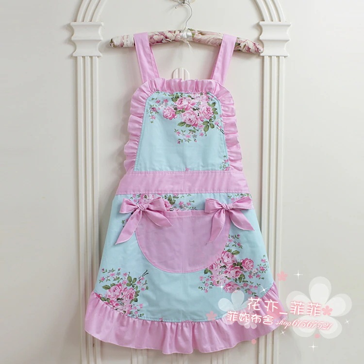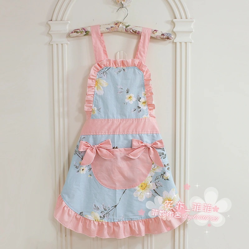 韓国風 ファッション エプロン 純綿 ブルー 大花 かわいい リボン 牧歌 ノースリーブ ホーム 大人 キッチン エプロン