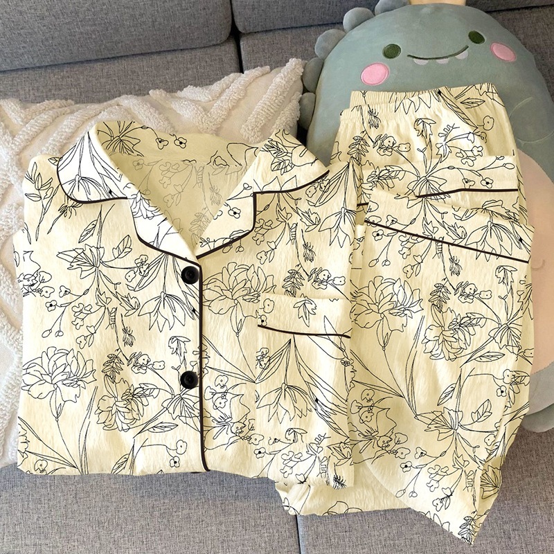 新中式レトロ風パジャマ女性春長袖高級感フラワールームウェア2点セット