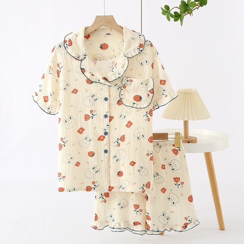 春夏半袖パジャマ薄綿二重ガーゼ吸汗通気性甘美ゆったりルームウェア半ズボンセット