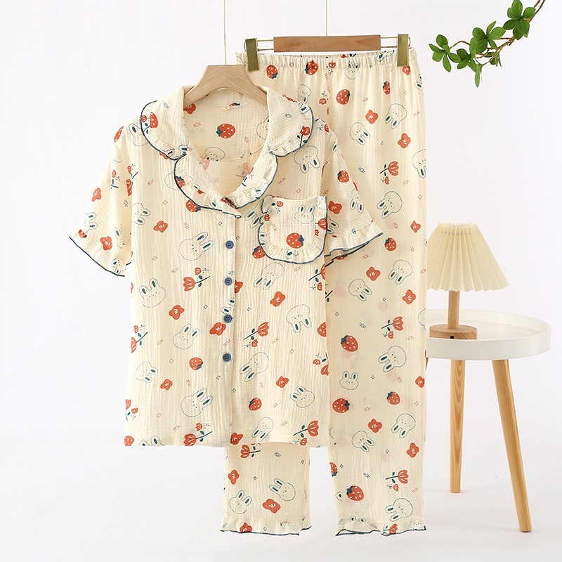 パジャマ女性純綿甘いウサギ夏の春秋薄半袖長ズボンセットゆったり部屋着通気吸汗汗