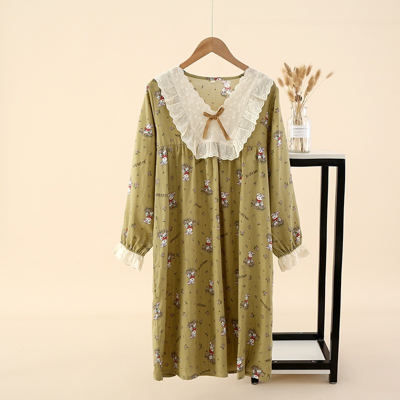 全綿ガーゼスリーパーレディース可愛い甘風ホームドレス緑ウサギ長袖スカート綿ロングスカート