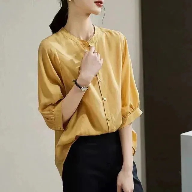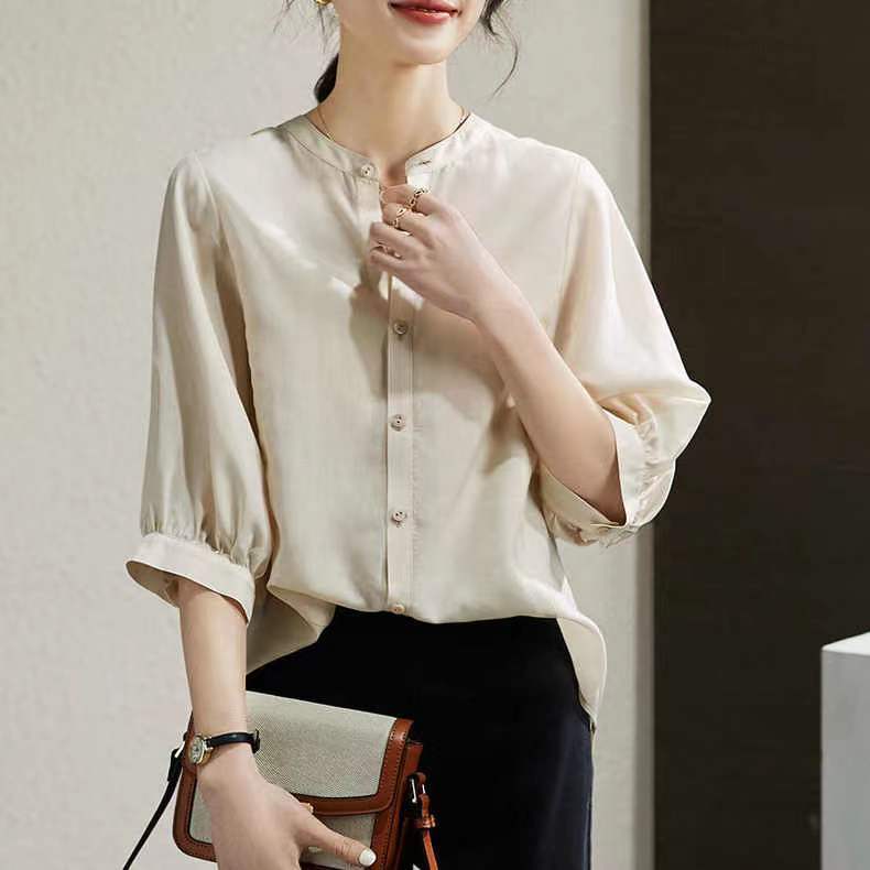 今っぽシアーシャツ 通勤 七分袖夏新作レトロゆったりスタンドカラーシャツカジュアル半袖トップス レディース 韓国ファッション