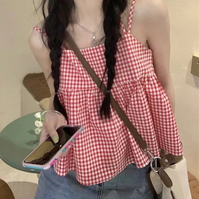 春 トップス キャミソール ノースリーブ Aライン ファッショ ンギンガム 春 レッド ファッション おしゃれ かわいい キュート 甘め カジュアル お出かけ