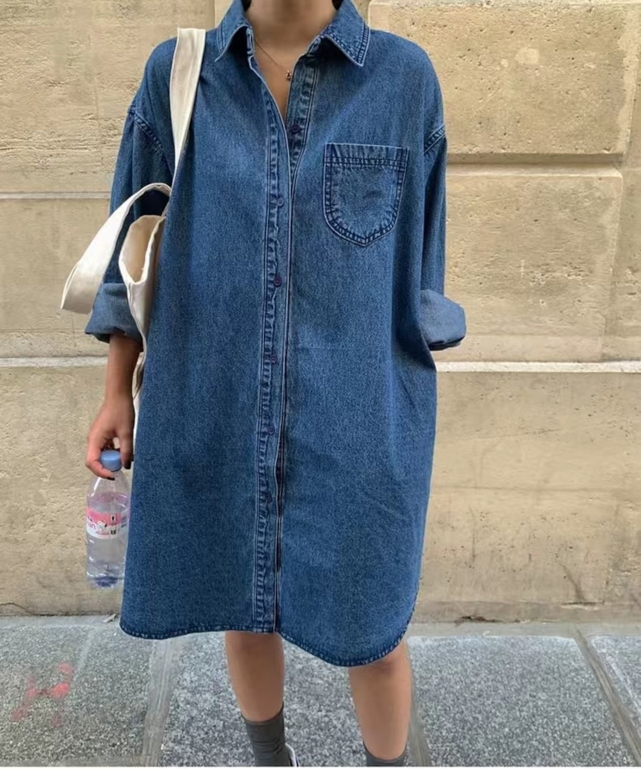 秋冬ワンピース シャツ 膝丈 デニム生地 ポケット 襟 スタンダードカラー ボタン 長袖 秋 水色 青 ブルー おしゃれ かわいい 韓国ファッション レディース お出かけ