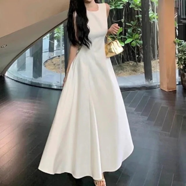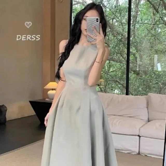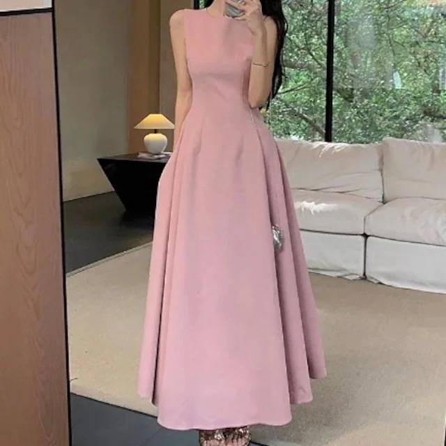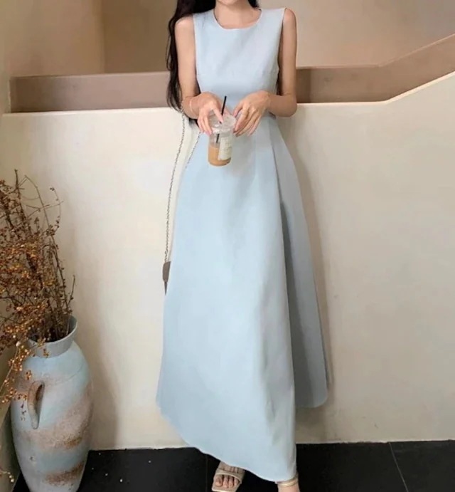春夏ワンピース ドレス ロング丈 ラウンドネック ノースリーブ 細見え 脚長効果 夏 黒 水色 おしゃれ かわいい カジュアル 韓国ファッション レディース お出かけ