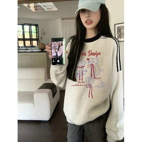 2024 秋冬 トレンド厚手裹起毛 2typeトップス長袖かわいいK-POPTロング黑白レディース韓国風ロゴ衣装ルーズゆったりプリントおしゃれサイズスリーブシルエットファッション系サイドシャツフット