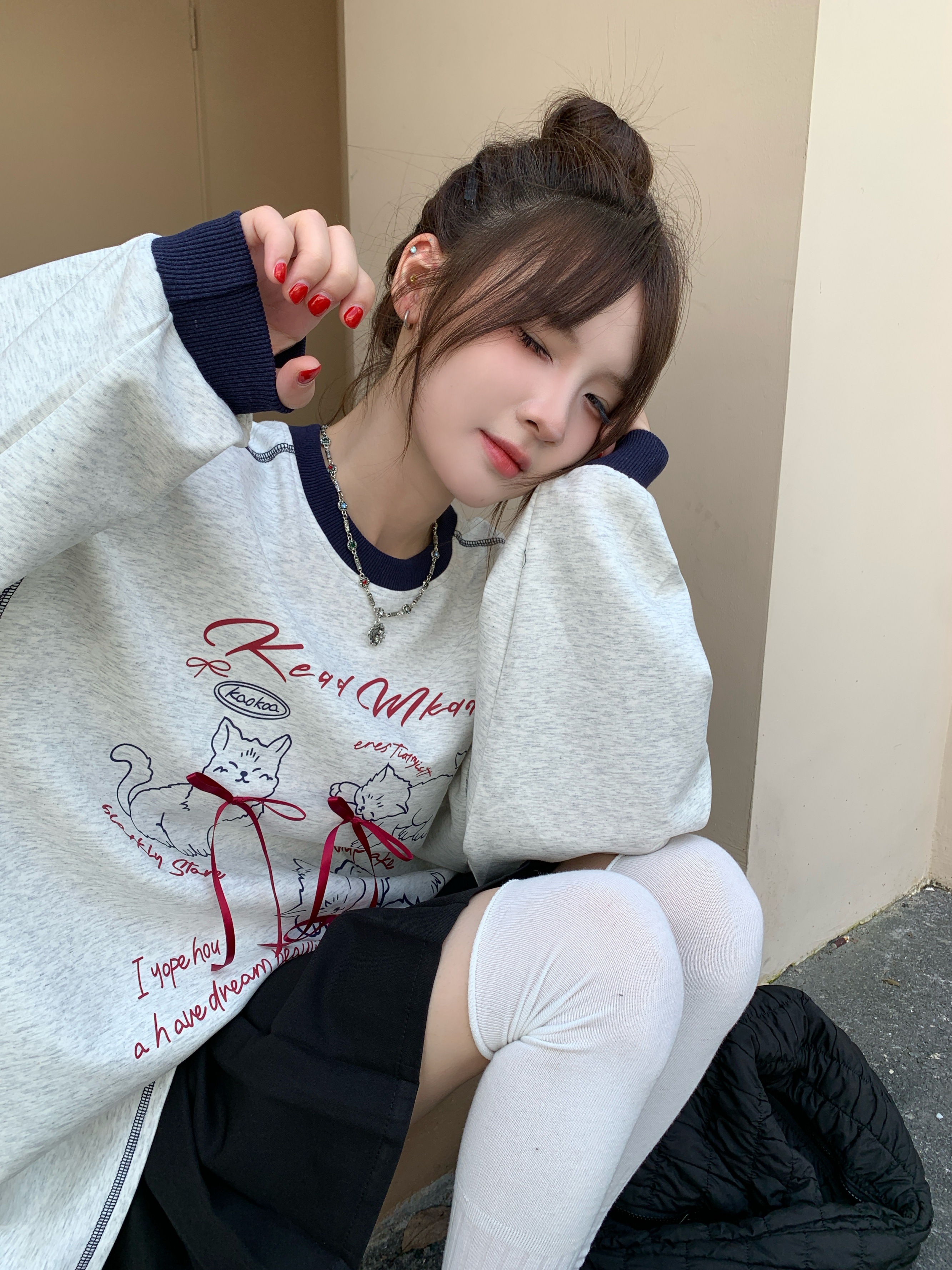 2024 秋冬 トップスバイカラー長袖TシャツかわいいK-POP黑白レディース韓国風ロゴ衣装ルーズゆったりカジュアルおしゃれサイズ袖プリントシルエットファッション系サイドシャツフット春スポーツT