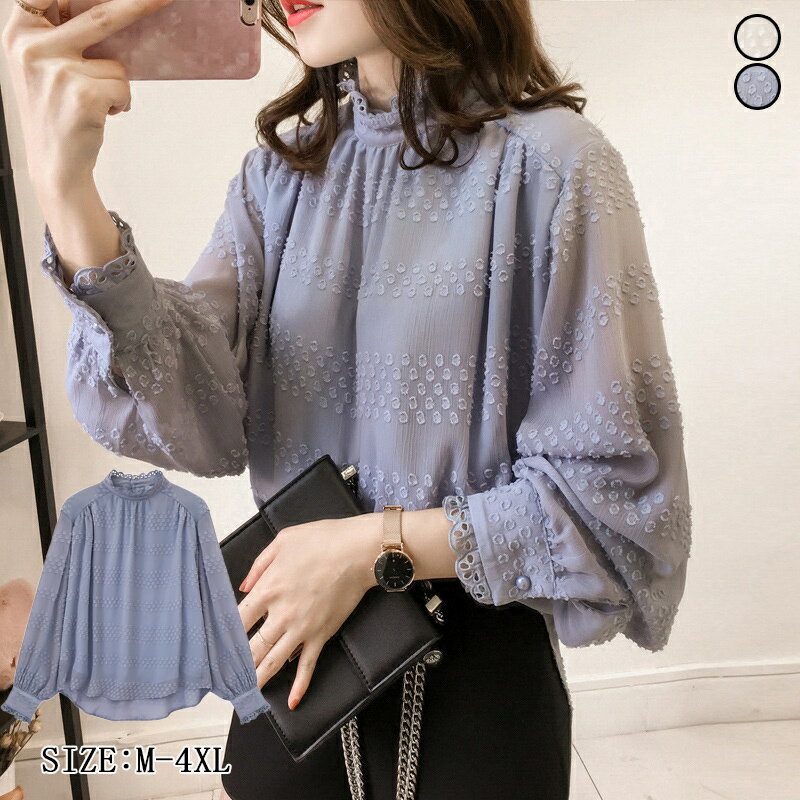 ブラウス プラクスぽわん袖シャツブラウスレディース長袖秋物シャツブラウス立ち襟ハイネックプチハイネックスタンドカラーノーカラー上品バルーン袖フリルゆったり体型カバー秋フォーマルトップスギャザー白シャツ