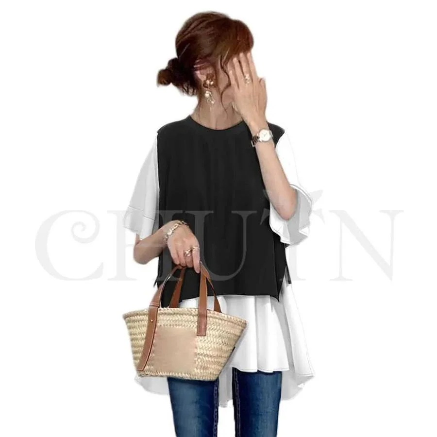 ブラウス レディース 切り替えブラウス半袖 夏トップス 偽二枚 ベルスリーブ フリル ラウンドネック 体型カバー プルオーバー ゆったり 着痩せカジュアル大人