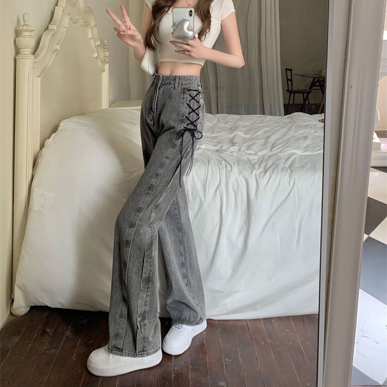 激壳れ人気品脚長効果!デニムパンツかっこいい!スラックスパンツストレートジーンズ春夏スモーキーグレーバンドinsゆったりワイドパンツ