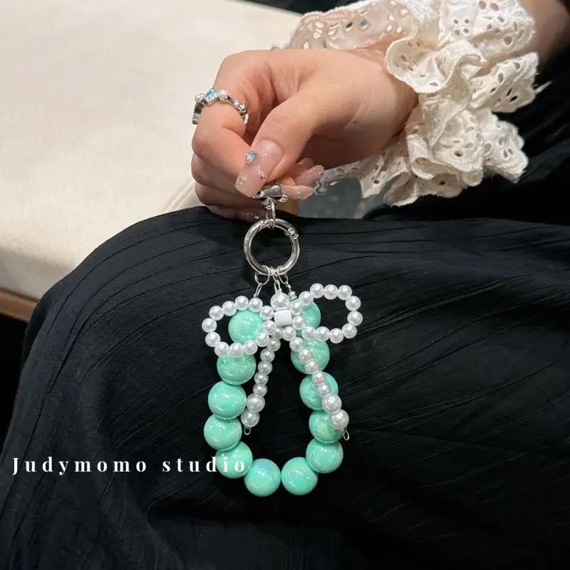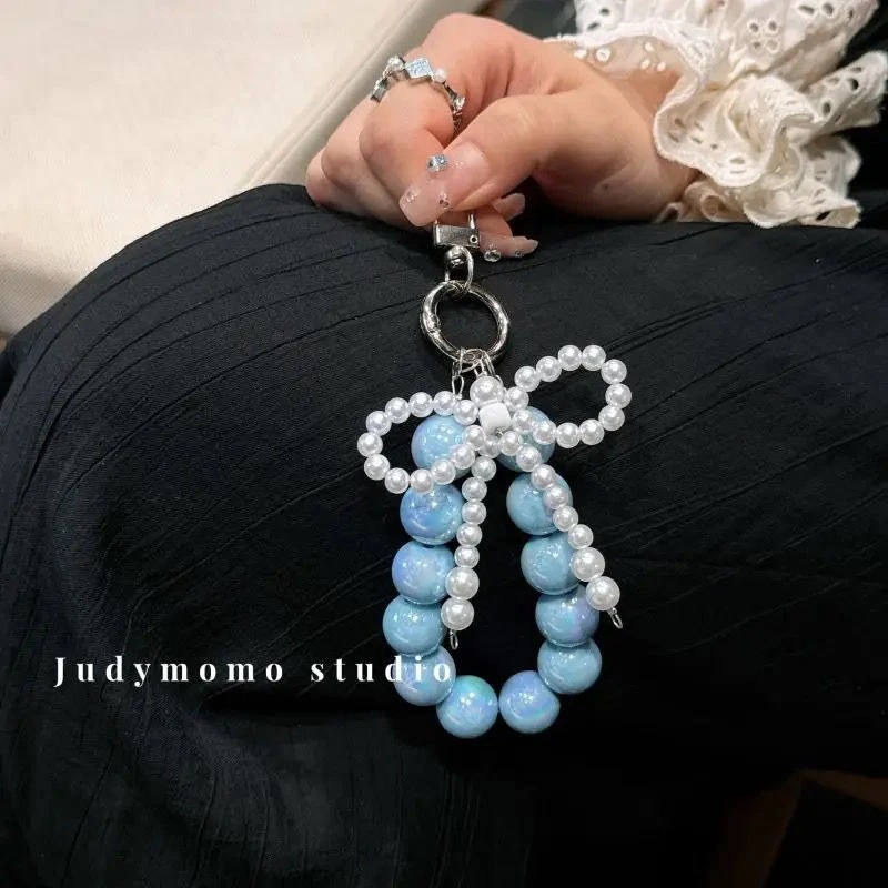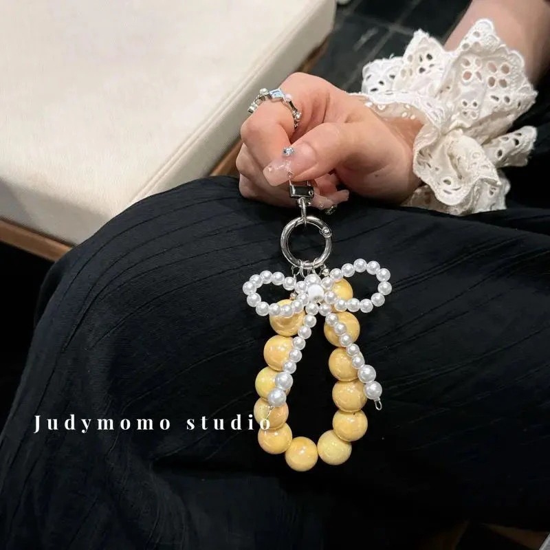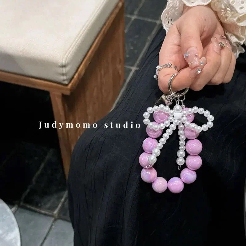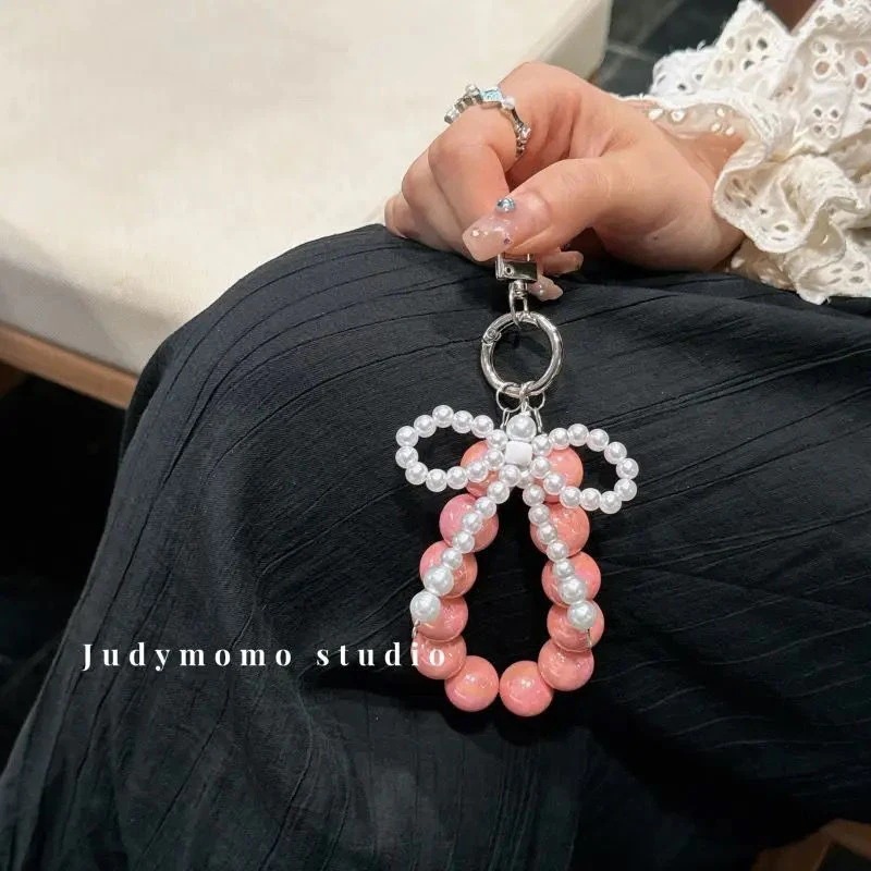 携帯電話のストラップの女の子真珠弓ビーズピンクのキーホルダーストラップバッグチャームチェーンを挿入します