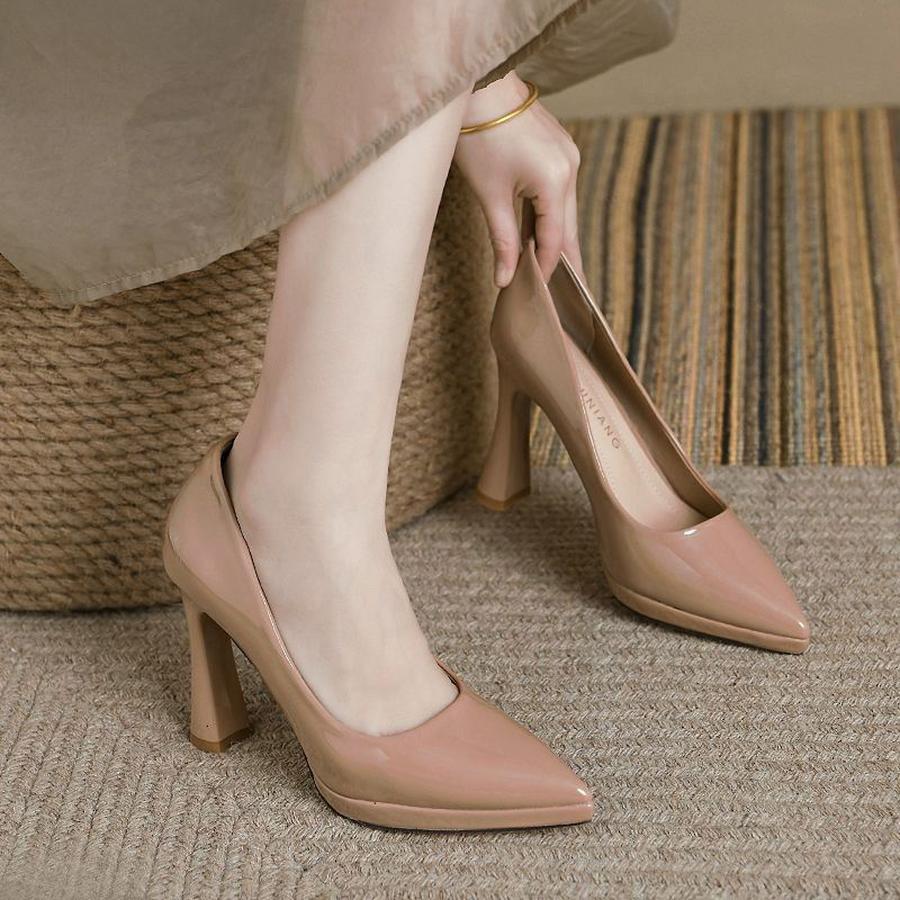 ヒールパンプス 春の新作太ヒール細ヒールハイヒール春秋気質尖ったヌードカラーのシングルシューズ パンプス