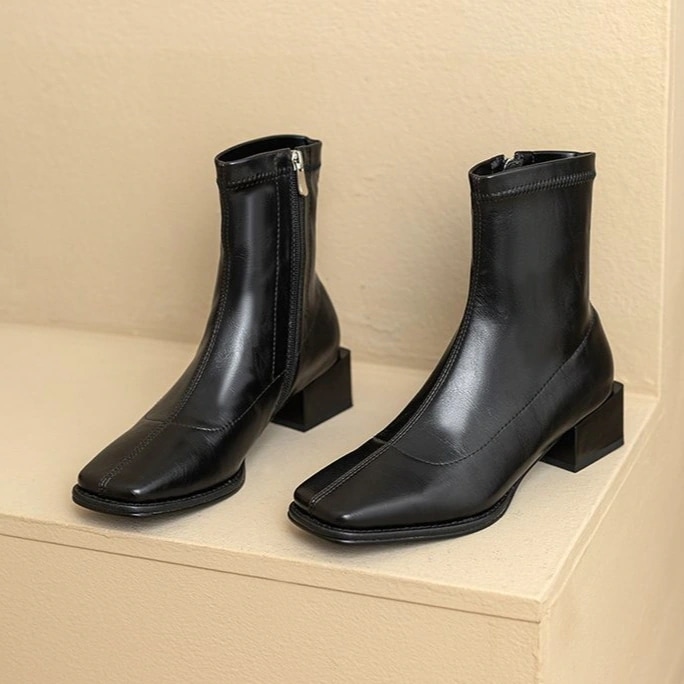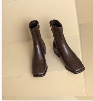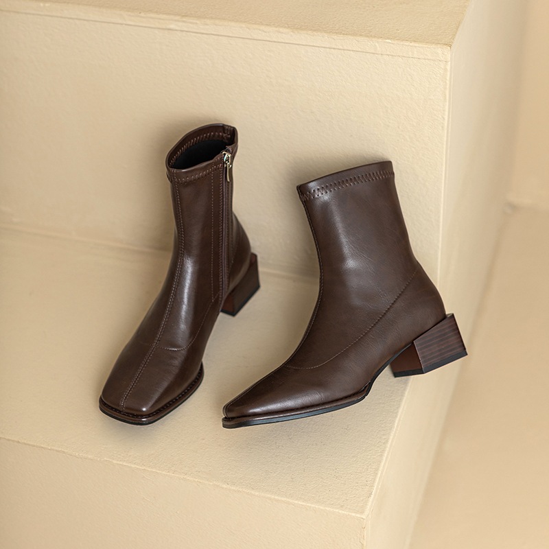 秋冬ファッション レディースショートブーツ スクエアヘッドブリティッシュミドルヒールブーツブラウンチャンキーヒールブーツ女性弾性ブーツ ブーツ 靴